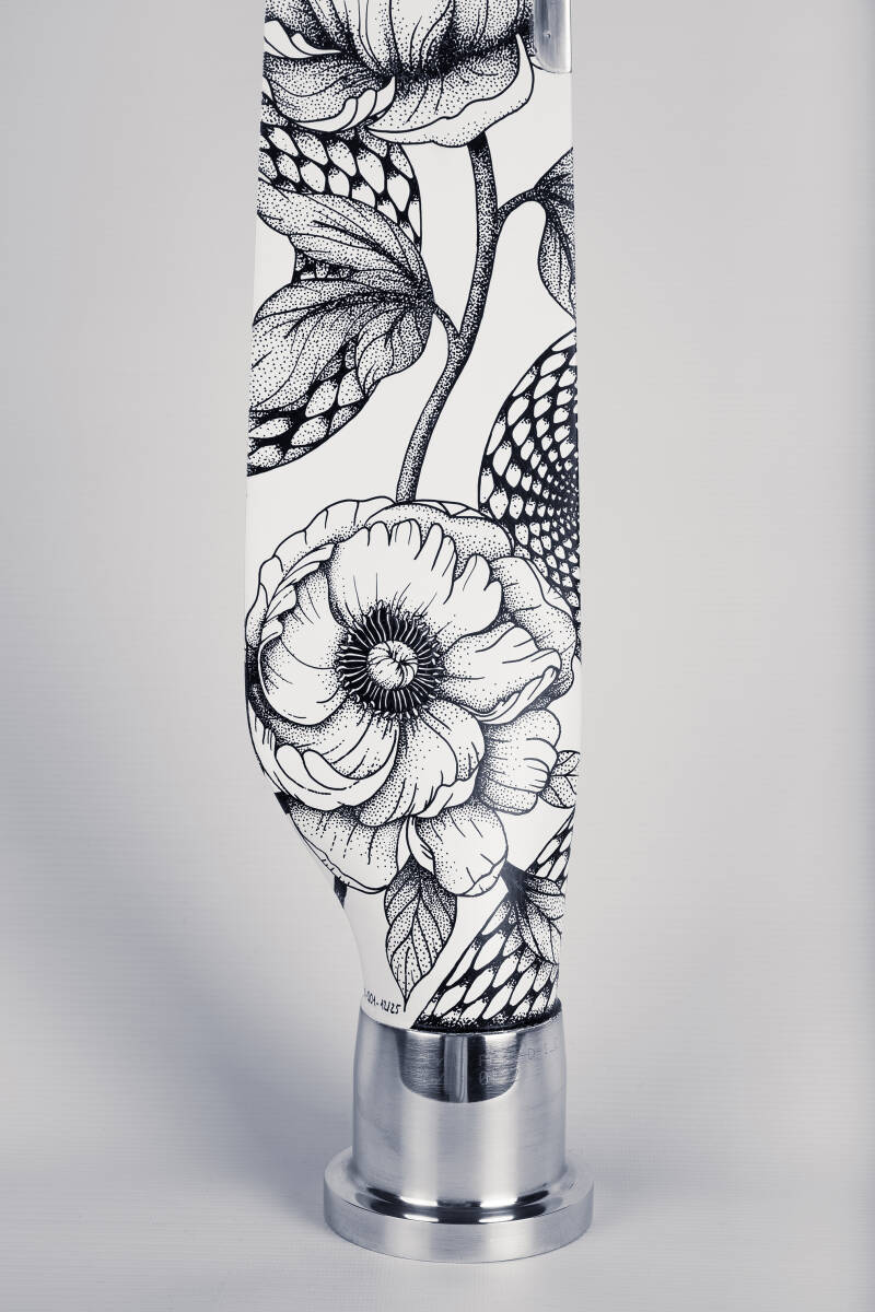 Cette pale customisée, baptisée « My Mind Is a Mountain » en hommage au titre des Deftones, marque le début d’une vaste série d’œuvres fusionnant art et aéronautique. Créée à partir d’une pale d’hélice Flair 2 fabriquée par Duc Hélices, cette pièce illustre l’alliance parfaite entre la précision industrielle et la finesse artistique du dot art.