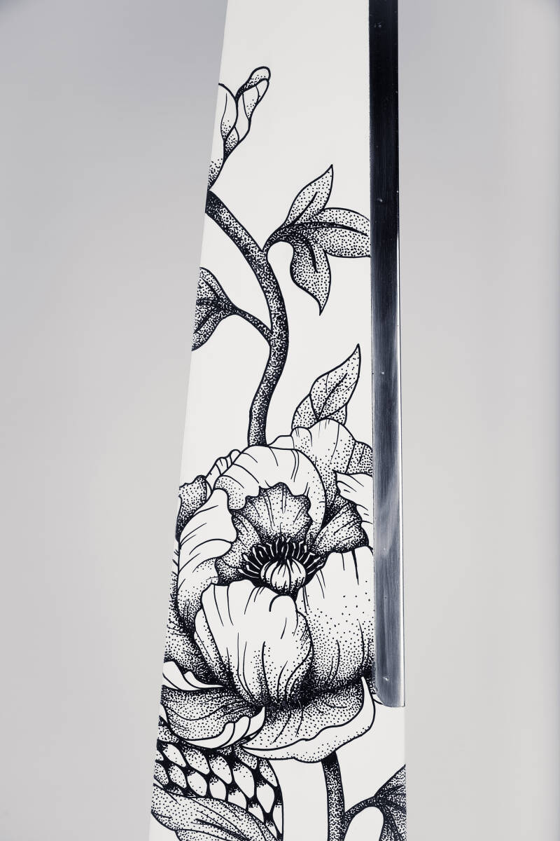 Le serpent, symbole puissant de transformation et d’énergie intérieure, s’élève gracieusement le long de la pale. Il est accompagné de pivoines, ces fleurs emblématiques de la culture japonaise, qui incarnent la force tranquille, la beauté maîtrisée et la prospérité. Leur présence adoucit l’intensité du serpent, apportant un équilibre harmonieux entre puissance et sérénité.