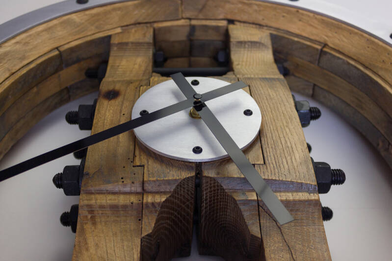 Ces anciennes roues en bois, témoins d'une époque révolue, renaissent avec une nouvelle fonction. Je les transforme en horloges uniques, où chaque veine du bois et trace du temps devient essentielle à leur identité.