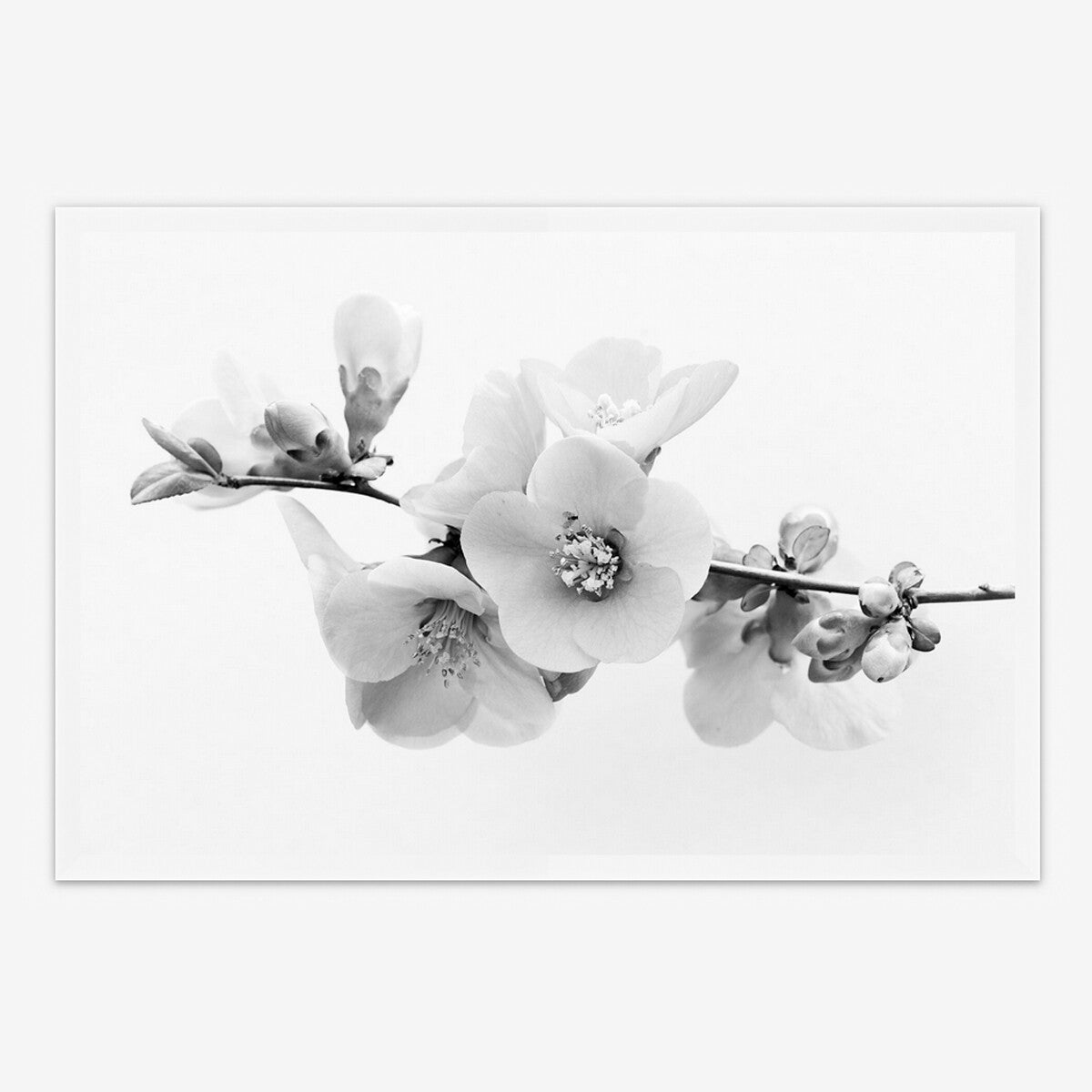 Cette macrophotographie en noir et blanc capture l'essence délicate du Cognassier du Japon en pleine floraison.