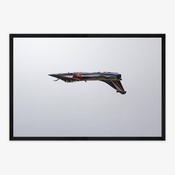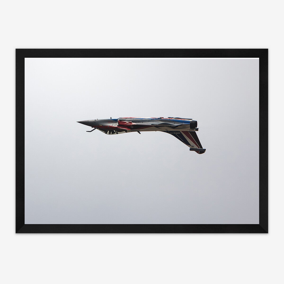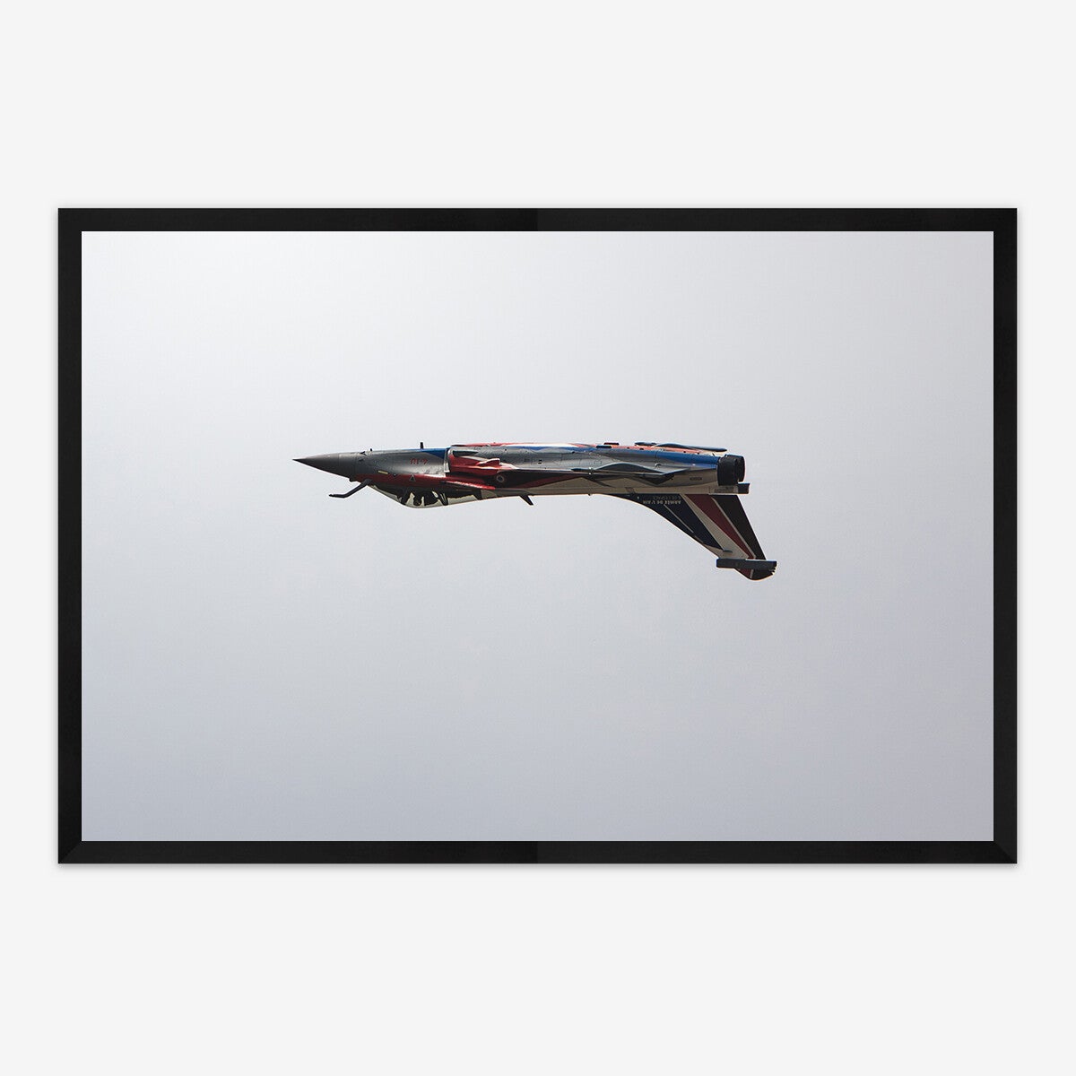 Symbole de l’excellence aéronautique française, le Rafale se révèle ici dans une manœuvre spectaculaire, ailes inversées, qui souligne toute son agilité et sa maîtrise. Sa livrée tricolore apporte une dimension graphique unique, entre puissance militaire et esthétisme visuel.