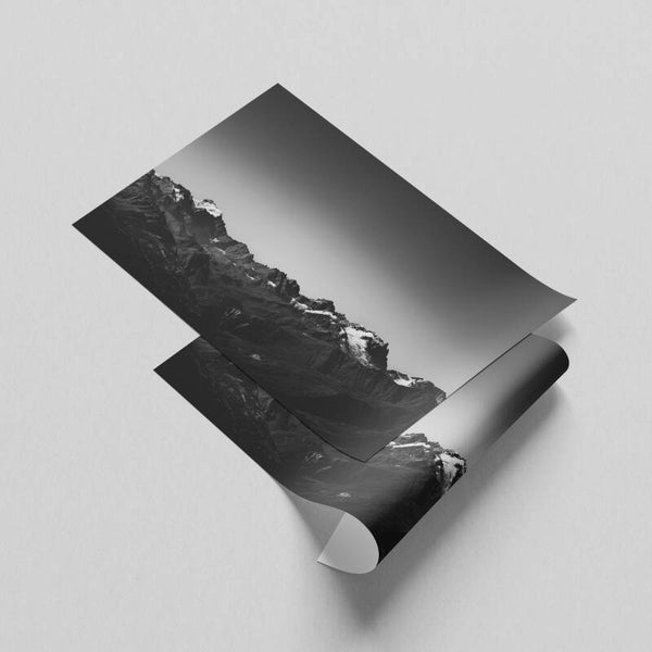 Les sommets emblém atiques des Écrins se dressent dans une intensité saisissante. En noir et blanc, le relief brut des montagnes se transforme en une fresque intemporelle, où la lumière sculpte les crêtes et souligne la majesté des glaciers.